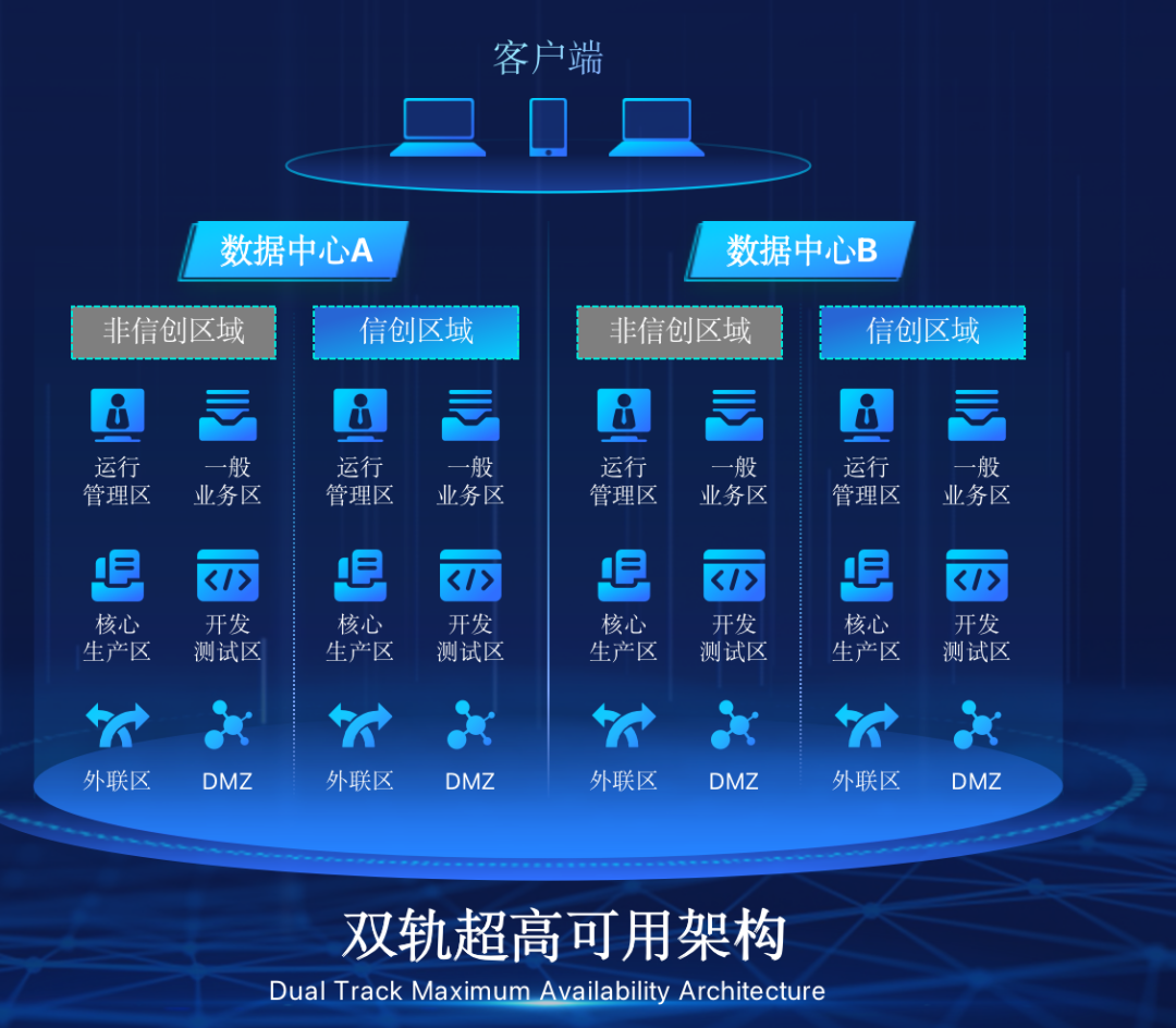 zoty中欧在企业面临自主创新IT基础重构过程中,推出的全新架构双轨超高可用架构(简称DTMAA),在双活数据中心的分区调度基础上,添加每个数据中心内信创域和非信创域的分域调度,来实现分区分域协同的多活双轨超高可用。